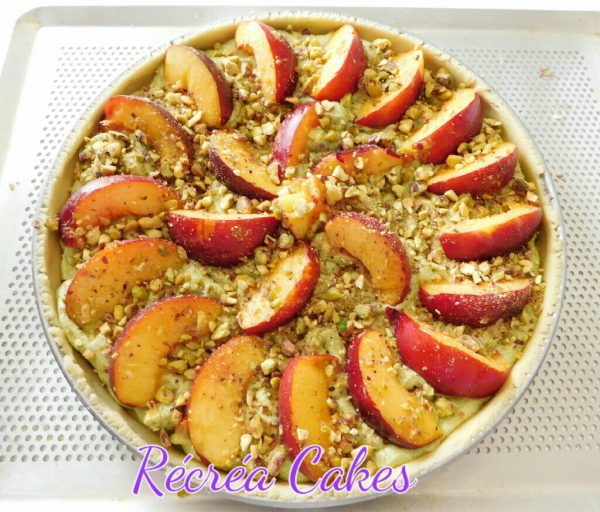 - Sortir la pâte du réfrigérateur , la déposer sur un plan fariné et l'étaler aux dimensions du cercle à tarte. La laisser reposer au frais le temps de couper les nectarines en quartiers. déposer la crème d'amandes sur le fond de tarte , disposer joliment les quartiers en rosaces sur le dessus et parsemer de pistaches concassées. Enfourner pendant 30 minutes dans un four préchauffé à 180 ° C. Laisser refroidir puis napper de confiture .